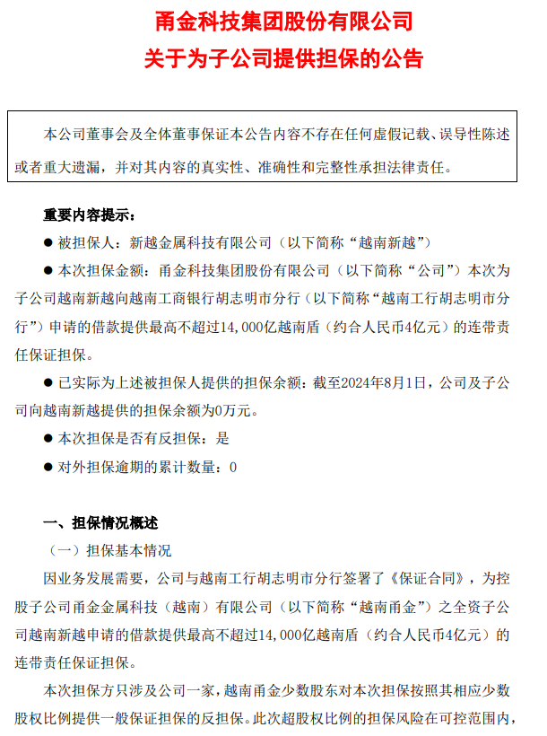 8月3日,據《甬金科技集團股份有限公司關于為子公司提供擔保的公告》稱,“因業務發展需要,公司與越南工行胡志明市分行簽署了《保證合同》,為控股子公司甬金金屬科技(越南)有限公司(以下簡稱“越南甬金”)之全資子公司越南新越申請的借款提供最高不超過14,000億越南盾(約合人民幣4億元)的連帶責任保證擔保。”(來源:甬金科技集團股份有限公司關于為子公司提供擔保的公告)